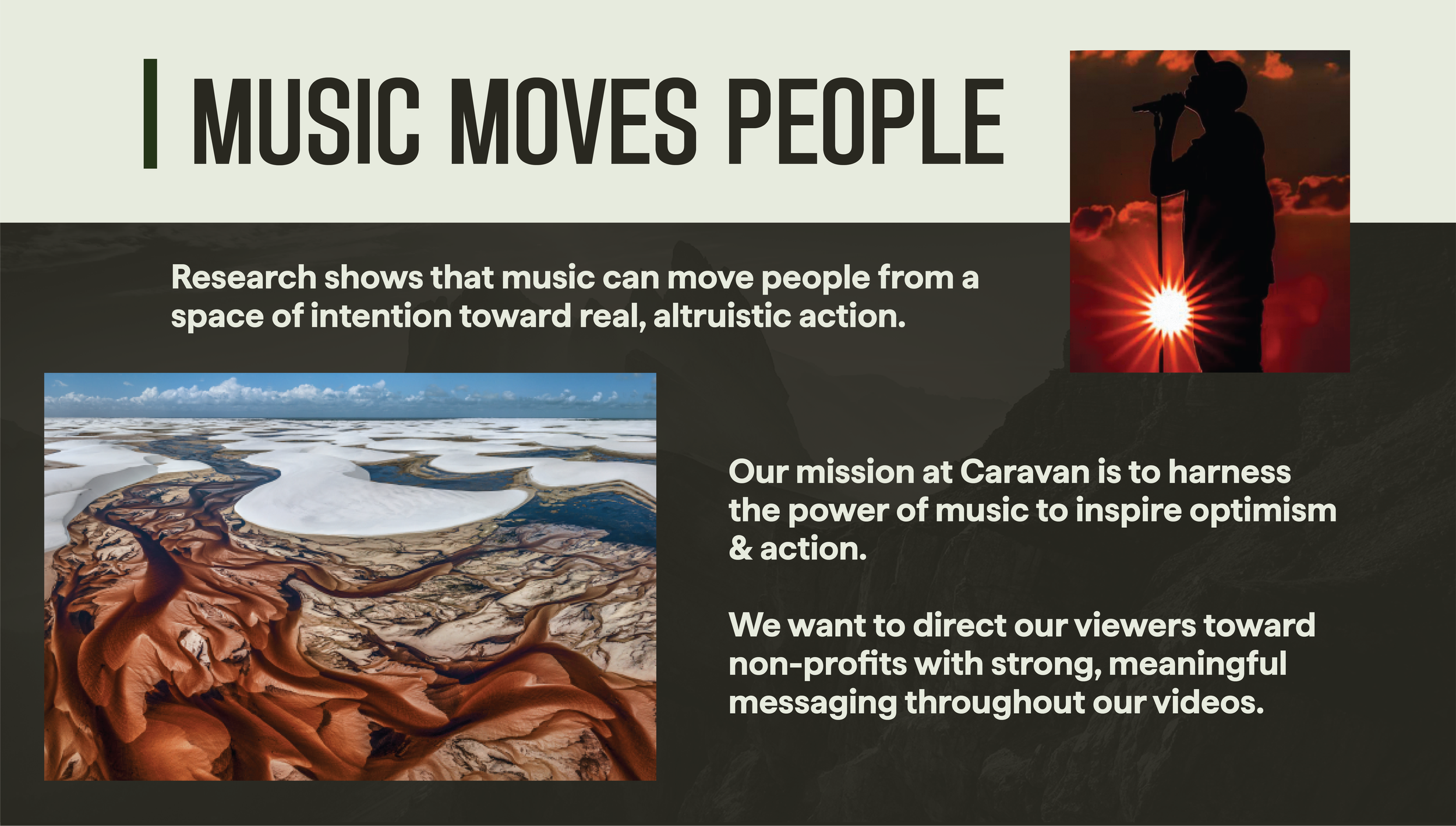 Caravan's primary goal is to create cinematic, intimate music performances in natural environments to tell stories at the intersection of music, culture, and nature. We aim to spotlight the work of non-profit organizations while promoting regional culture and environmental awareness.